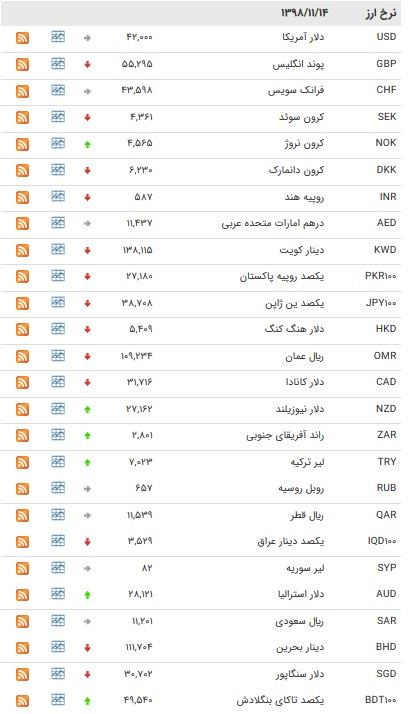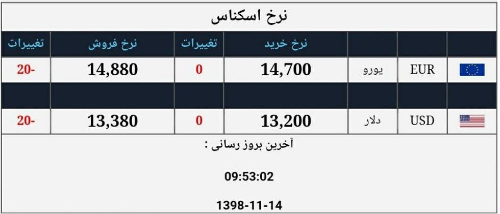 امروز، (۱۴ بهمن ۹۸) هر دلار آمریکا به مبلغ ۱۳ هزار و ۳۸۰ تومان و هر اسکناس یورو به قیمت ۱۴ هزار و ۸۸۰ تومان معامله شد.همچنین بانک مرکزی نرخ رسمی ۴۷ ارز را اعلام کرد بر این اساس نرخ ۱۱ ارز بین بانکی ثابت ماند، ۲۳ ارز کاهش و ۱۳ ارز نیز افزایش یافت.