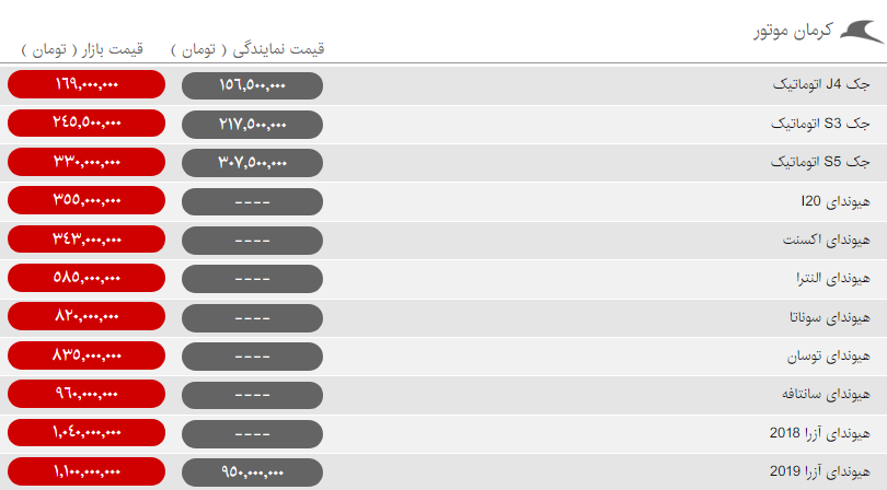 محصولات کرمان موتور دوباره با افزایش قیمت به استقبال مشتریانشان آمدهاند و این بار در عرض یک روز تا هفت میلیون تومان گرانی را در کارنامه خود ثبت کردهاند.محصولات مدیران خودرو نیز امروز تغییری نسبت به روز قبل پیدا نکردهاند. قیمت این محصولات در بازار بعد افزایش قیمتی که در هفته اخیر اتفاق افتاده، از نرخ مصوب کارخانه پیشی گرفته است.
