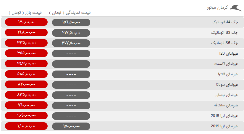 محصولات کرمان موتور دوباره با افزایش قیمت به استقبال مشتریانشان آمدهاند و این بار در عرض یک روز تا پنج میلیون تومان گرانی را در کارنامه خود ثبت کردهاند. امروز جک J۴ حدود یک میلیون تومان افزایش قیمت پیدا کرده و به ۱۷۰ میلیون تومان رسیده است. باید توجه داشته باشید که نرخ مصوب کارخانه برای جک J۴ رقمی حدود ۱۵۶ میلیون و ۵۰۰ هزار تومان در نظر گرفته میشود و تقریبا ۱۳ میلیون پایینتر از قیمت بازار است.محصولات مدیران خودرو به روند گرانی که از تعطیلات آخر هفته گذشته در پیش گرفته بودند، ادامه میدهند. طوری که امروز هم شاهد افزایش قیمت محصولات این شرکت تا ۱۱ میلیون تومان هستیم.