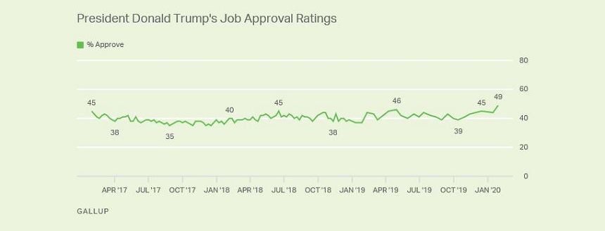 نظرسنجی گالوپ در بحبوحه محاکمه استیضاح، بین ۱۶ تا ۲۹ ژانویه انجام شد. در همین نظرسنجی، ۵۲ درصد آمریکاییها خواستار تبرئه و ۴۶ درصد خواستار محکومیت و عزل ترامپ شدند. گالوپ، علاوه بر استیضاح، سه عامل دیگر را در افزایش محبوبیت ترامپ دخیل میداند. در همین نظرسنجی، ۵۳ درصد آمریکاییها از ترور سردار قاسم سلیمانی، فرمانده سپاه قدس، که در یک حمله پهپادی آمریکایی در سوم ژانویه در بغداد ترور شد، حمایت کرده و ۴۵ درصد مخالفت کرده بودند.