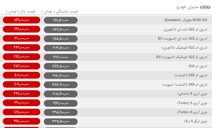 امروز در محصولات مدیران خودرو MVM 315 حدود سه میلیون تومان گران شده و در بازار با قیمت ۱۵۶ میلیون تومان خرید و فروش میشود. از طرف دیگر MVM X33 بیشترین افزایش قیمت را به نام خود ثبت کرده و حدود هفت میلیون تومان گران شده است. طوری که قیمت روز این محصول مدیران خودرو در حال حاضر به ۲۸۲ میلیون تومان رسیده است.