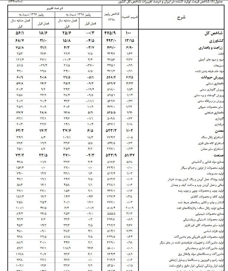 تغییرات میانگین شاخص کل قیمت تولیدکننده در چهار فصل منتهی به فصل پاییز ١٣٩٨ نسبت به دوره مشابه در سال قبل به 50 درصد رسید که نسبت به همین اطلاع در فصل قبل ٩.٩ واحد درصد کاهش نشان می­‌دهد. در فصل مورد بررسی، در میان بخش­های اصلی تولیدی در کشور، کمترین تورم سالانه مربوط به بخش برق (٢.٣- درصد ) و بیش­ترین آن مربوط به بخش صنعت (٦١.٥ درصد) است.