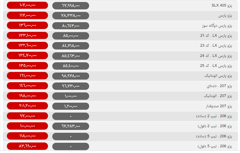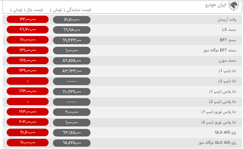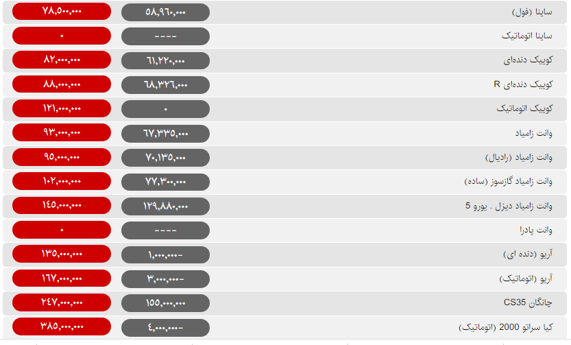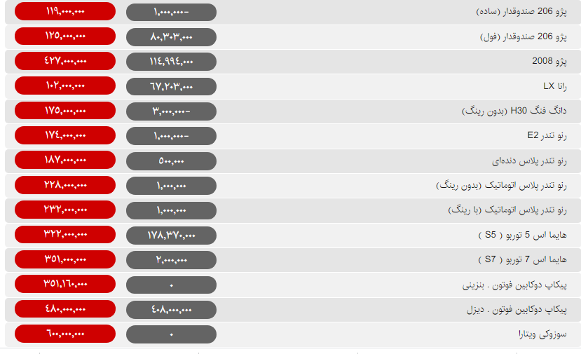 قیمت بسیاری از خودروهای داخلی امروز با کاهش ۵۰۰ هزار تا یک میلیون تومانی همراه شده است.تنها گرانی امروز را دو خودروی پژو ۲۰۰۸ و وانت آریسان داشتهاند که هر کدام به ترتیب یک میلیون و ۵۰۰هزار تومان نسبت به روز گذشته گرانتر شدند.