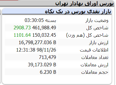 معاملات بورس روزی پر نوسان را پشت سر گذاشت و درحالی که شاخص کل این بازار در نخستین ساعت معاملات ۴۵۹ هزار واحد بود، در ساعات میانی به بیش از ۴۶۵ هزار واحد رسید و در نهایت در رقم ۴۶۱ هزار و ۹۸۸ واحد ایستاد.