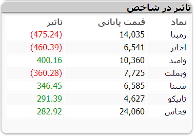 در این میان سنگ آهن گهر زمین، پتروشیمی مارون، فولاد هرمزگان جنوب، صنایع ماشین های اداری ایران، فرابورس ایران و شرکت آهن و فولاد ارفع نسبت به سایر نمادها بیشترین تاثیر مثبت و در مقابل فقط هلدینگ صنایع معدنی خاورمیانه نسبت به سایر نمادها بیشترین تاثیر منفی را روی بازار داشت.