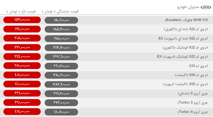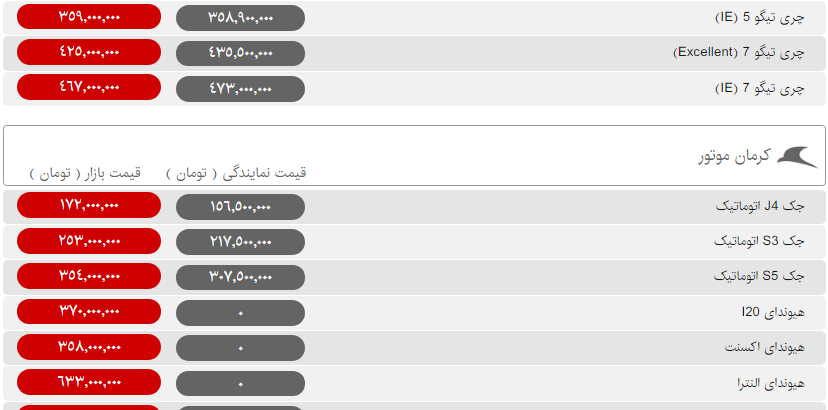 محصولات کرمان موتور امروز همچنان رکورددار افزایش قیمت است و رکورددار آنها جک S۵ است که امروز با افزایش قیمت نه میلیونی به 354 میلیون تومان رسیده است.محصولات مدیران خودرو امروز دفتار دوگانهای در بازار دارند. MVM ۳۱۵ هاچبک حدود یک میلیون تومان ارزش خود را از دست داده و در حال حاضر ۱۵۳ میلیون تومان قیمتگذاری میشود. MVM X۲۲ دندهای هم حدود دو میلیون تومان ارزان شده و به ۱۹۴ میلیون تومان بازگشته است. در طرف مقابل MVM X۲۲ اتوماتیک امروز شش میلیون تومان افزایش قیمت را در کارنامه خود ثبت کرده و به ۲۳۰ میلیون تومان رسیده است