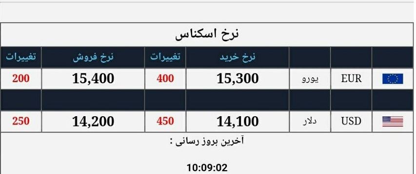 قیمت یورو نیز برای فروش در صرافی ملی ۱۵۴۰۰ تومان اعلام شده است؛ قیمت خرید یورو نیز در این صرافیها ۱۵۳۰۰ تومان است.