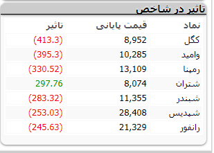 پتروشیمی مارون و گروه توسعه مالی مهر نسبت به سایر نمادها بیشترین تاثیر مثبت و در مقابل هولدینگ صنایع معدنی خاورمیانه، سهامی ذوب آهن اصفهان، فولاد هرمزگان جنوب، تولید نیروی برق دماوند و صنایع ماشینهای اداری ایران نسبت به سایر نمادها بیشترین تاثیر منفی را در فرابورس داشتند.