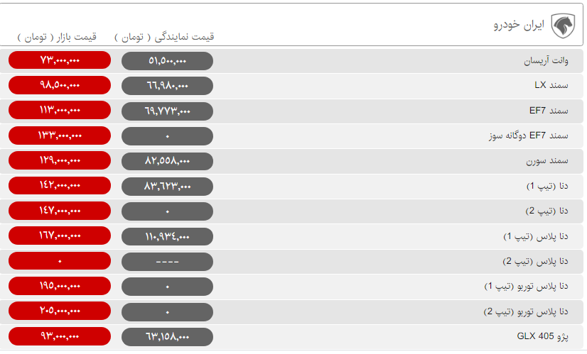 دنا پلاس توربو بعد از افزایش قیمت روز گذشته، امروز کمی عقبنشینی کرده و با کاهش قیمت یک میلیون تومانی به ۲۰۵ میلیون تومان رسیده است. در طرف مقابل دنا معمولی تیپ ۱ در بازار ۳۰۰ هزار تومان گران شده و با نرخ ۱۴۲ میلیون تومان در بازار خرید و فروش میشود.