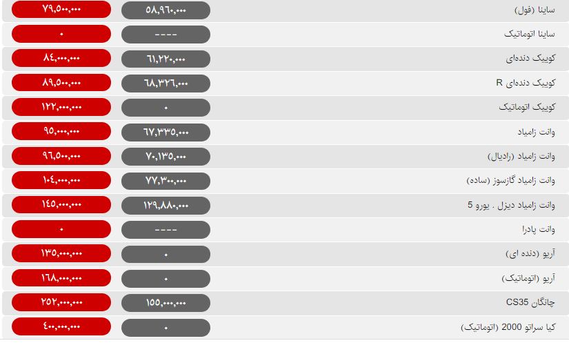 قیمت روز خودروهای داخلی ۲۹ بهمن؛ ثبات قیمت در بازار خودرو