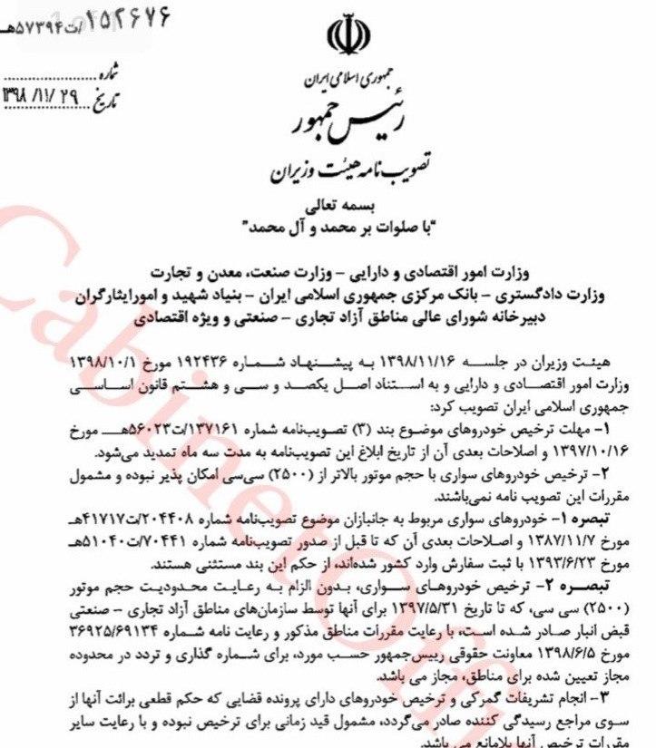 افزون بر این، ترخیص خودروهای سواری، بدون الزام به رعایت محدودیت حجم موتور 2500 سی سی که تا تاریخ 31 مرداد 1397 برای آنها از سوی سازمانهای مناطق آزاد تجاری - صنعتی قبض انبار صادر شده است با رعایت مقررات مناطق مذکور و سایر قوانین موجود، برای شمارهگذاری و تردد در محدوده مجاز تعیین شده برای مناطق، مجاز است.