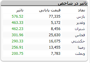 پتروشیمی مارون، فولاد هرمزگان جنوب، صنایع ماشینهای اداری ایران، فرابورس ایران، گروه توسعه مالی مهر آیندگان و تولید نیروی برق دماوند نسبت به سایر نمادها بیشترین تاثیر مثبت و در مقابل پتروشیمی زاگرس نسبت به سایر نمادها بیشترین تاثیر منفی را بر فرابورس گذاشتند.