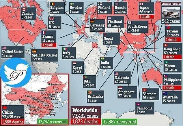 آمارهای رسمی از ابتلای ۷۳ هزار و ۴۳۲ نفر در جهان به ویروس کرونا حکایت دارد که از این تعداد حدود ۹۸ درصد یعنی ۷۲ هزار ۴۳۸ نفر در چین به این ویروس مبتلا شده اند از طرفی تا ۳۰ بهمن ۲۰۰۴ نفر به علت ابتلا به این ویروس فوت شدند که ۱۸۶۸ نفرها در چین بوده اند.