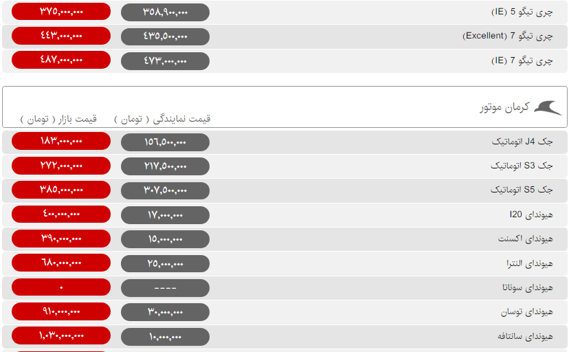 محصولات کرمان موتور امروز دوباره ۱۰ میلیون تومان جهش کردهاند. جک S5 سردمدار آنها است و از ۳۶۵ میلیون تومان آخر هفته پیش، حالا به 385 میلیون تومان رسیده است.محصولات مدیران خودرو دوباره به ثبات قیمت بازگشتهاند. قیمت این محصولات در پی افزایش قیمت هفتههای اخیر، حسابی از نرخ مصوب کارخانه فاصله گرفته است