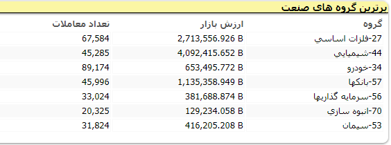 سهامی ذوب آهن اصفهان، سنگ آهن گهرزمین، هلدینگ صنایع معدنی خاورمیانه، پتروشیمی زاگرس، پتروشیمی مارون، فولاد هرمزگان جنوب و صنایع ماشینهای اداری ایران نسبت به سایر نمادها بیشترین تاثیر مثبت را بر شاخص فرابورس داشتند.