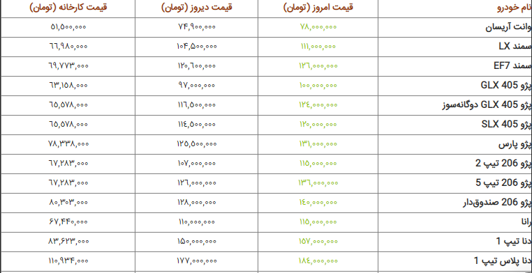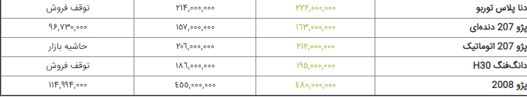 به گزارش سایت طلا به نقل از فرارو پژو پارس با افزایش قیمت پنج میلیون و ۵۰۰ هزار تومانی در بازار ظاهر شده و امروز حدود ۱۳۱ میلیون تومان قیمتگذاری میشود. رانا هم پنج میلیون تومان گران شده و به ۱۱۵ میلیون تومان رسیده است. دانگفنگ H۳۰ افزایش قیمت ۹ میلیون تومانی را پشت سر گذاشته و در حال حاضر حدود ۱۹۵ میلیون تومان قیمت دارد.