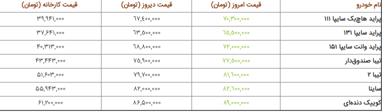 خودروهای سایپا تا سه میلیون تومان افزایش قیمت را پشت سر گذاشتهاند. کمترین گرانی مربوط به ساینا است که امروز حدود ۶۰۰ هزار تومان افزایش قیمت پیدا کرده و به ۸۲ میلیون و ۶۰۰ هزار تومان رسیده است. تیبا صندوقدار نسبت به روز گذشته حدود یک میلیون و ۶۰۰ هزار تومان گران شده و در حال حاضر ۷۷ میلیون و ۵۰۰ هزار تومان خرید و فروش میشود.