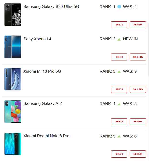 سامسونگ گلکسی A51، ردمی نوت ۸ پرو و گلکسی A71 از شرایط فعلی فهرست ما بهره برده و جایگاه خود را بهبود بخشیدهاند. اکنون گلکسی A51 چهارم، گلکسی A71 ششم و ردمی نوت ۸ در مقام هشتم قرار دارند.