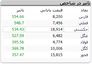 عمده نمادهای مهم بورسی امروز در تقویت شاخص کل بورس اثرگذار بودند که از جمله میتوان نمادهای صنایع پتروشیمی خلیج فارس، ملی مس ایران، کشتیرانی جمهوری اسلامی، گلکزان، فولاد مبارکه اصفهان، صنعتی و معدنی گلگهر و فولاد خوزستان اشاره کرد.