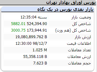 شاخص کل بورس اوراق بهادار تهران در پایان معاملات امروز چهارشنبه با جهش 5 هزار و 881 واحدی روبهرو شد.معاملات امروز بازار سرمایه در حالی به پایان رسید که سهام شرکتهای بزرگی مانند صنایع پتروشیمی خلیج فارس، ملی صنایع مس ایران، کشتیرانی جمهوری اسلامی ایران و غیره رشد قابل توجهی داشتند.