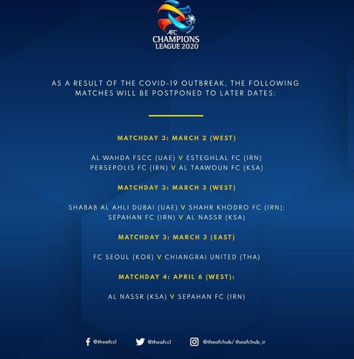 پیش از AFC با ارسال نامه به فدراسیون ایران از تعویق بازی ها خبر داده بود. تنها بازی سپاهان با النصر در لیگ قهرمانان آسیا علاوه بر هفته سوم در هفته چهارم هم لغو شد.