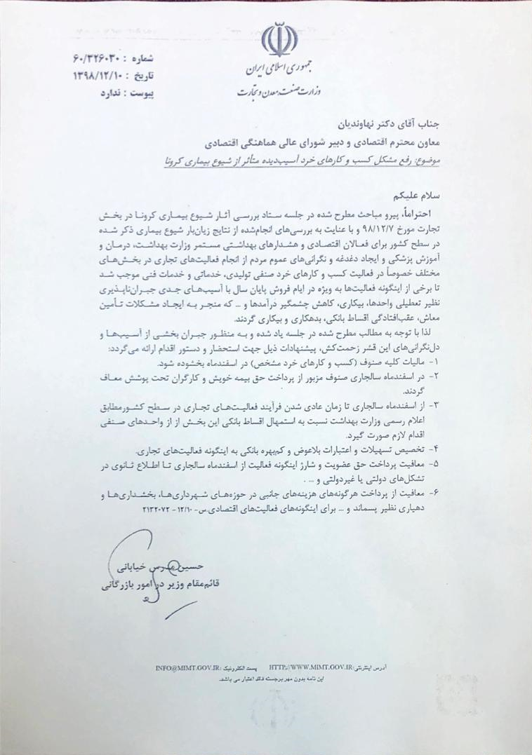 قائم مقام وزیر در امور بازرگانی با ارسال نامهای به معاون اقتصادی و دبیر شورای عالی هماهنگی اقتصادی پیشنهاداتی را برای جبران بخشی از آسیبها و دلنگرانیهای کسب و کارهای خرد آسیبدیده متأثر از شیوع بیماری کرونا شد