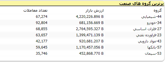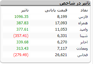 نمادهای صنایع پتروشیمی خلیجفارس، ارتباطات سیار ایران، سرمایهگذاری امید، مخابرات ایران، توسعه معادن و فلزات همگی در تقویت شاخص بورس تهران مؤثر بودند و نمادهای پالایش نفت اصفهان و فولاد خراسان بیشترین اثر کاهشی در شاخص بورس را داشتند.