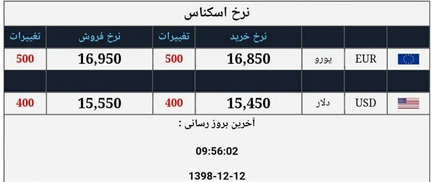 نرخ ارز در صرافی ملی امروز دوشنبه اعلام شد که بر این اساس بهای دلار نسبت به پایان وقت دیروز ۴۰۰ تومان افزایش یافت و قیمت دلار به ۱۵ هزار و ۵۵۰ تومان رسید.از طرفی بانک مرکزی نرخ ۴۷ ارز را برای امروز(دوشنبه ۱۲ اسفند ۹۸) اعلام کرد که بر اساس آن، نرخ ۲۷ ارز افزایش، ۱۰ ارز کاهش و ۱۰ ارز ثابت ماند.