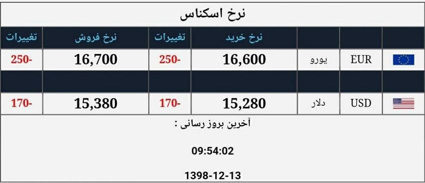 نرخ ارز در صرافی ملی امروز سهشنبه اعلام شد که بر این اساس بهای دلار نسبت به پایان وقت دیروز ۱۷۰ تومان کاهش یافت و قیمت دلار به ۱۵ هزار و ۳۸۰ تومان رسید.بانک مرکزی نیز نرخ ۴۷ ارز را برای امروز ۱۳ اسفند اعلام کرد که بر اساس آن نرخ ۲۳ ارز مانند یورو افزایش و قیمت ۱۴ واحد پولی دیگر مانند پوند کاهش یافت. نرخ دلار و ۹ ارز دیگر نیز ثابت ماند.
