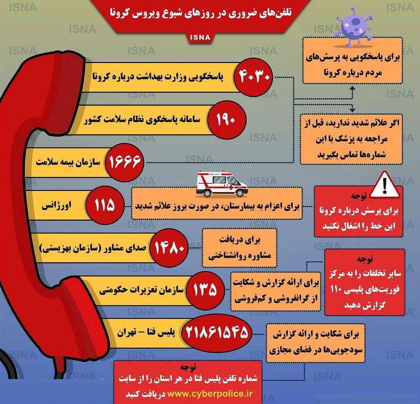 در روزهای شیوع ویروس کرونا ضروری است از برخی شماره تلفنها و کاربردهای آنها اطلاع داشته باشیم. این شمارهها طیفی از نیازها، از مشاوره پزشکی تا اعلام گزارش تخلفات را شامل میشود. در این اینفوگرافیک از چند شماره تلفن ضروری در دوران شیوع ویروس کرونا در ایران مطلع خواهید شد.