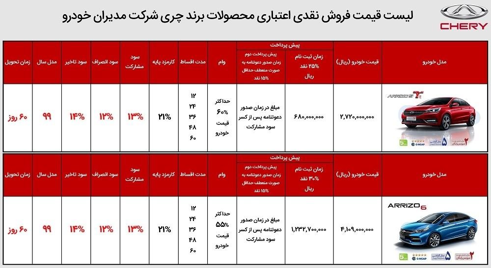 بر اساس اعلام شرکت مدیران خودرو در طرح ذکرشده دو خودروی چری آریزو ۵ و چری آریزو ۶ با اقساط ۱۲ تا ۶۰ ماهه آماده واگذاری به متقاضیان میباشند.
