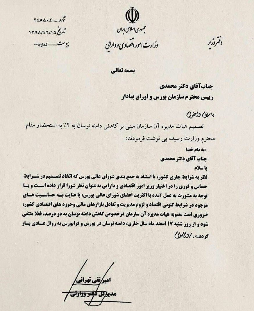وزیر اقتصاد و رئیس شورایعالی بورس بر اساس مشورت بهعملآمده با اکثریت اعضای شورایعالی بورس به رئیس سازمان بورس و اوراق بهادار دستور داد مصوبه هیئت مدیره آن سازمان در خصوص کاهش دامنه نوسان به دو درصد، بهدلیل لزوم مدیریت و تعادل بازارهای مالی در حوزههای اقتصادی کشور، فعلاً منتفی شود و تأکید کرد از روز شنبه (17 اسفندماه جاری)، دامنه نوسان در بورس و فرابورس از 2 درصد به روال عادی بازگردد.