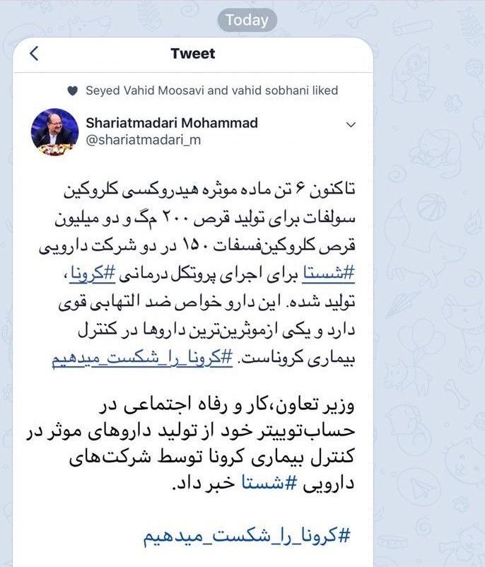 به گزارش سایت طلا محمد شریعتمداری وزیر تعاون، کار و رفاه اجتماعی در صفحه شخصی خود در فضای مجازی نوشت: تاکنون 6 تن ماده مؤثره هیدروکسی کلروکین سولفات برای تولید قرص 200 مگ و دو میلیون قرص کلروکین فسفات 150 در دو شرکت دارویی شستا برای اجرای پروتکل درمانی کرونا تولید شده است. این دارو خواص ضدالتهابی قوی دارد و یکی از مؤثرترین داروها در کنترل بیماری کروناست.