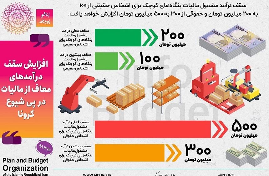 بر این اساس بعد از شیوع بیماری کرونا، سقف درآمد مشمول بنگاههای کوچک برای اشخاص حقیقی از 100 میلیون به 200 میلیون تومان و حقوقی از 300 به 500 میلیون تومان افزایش خواهد یافت.