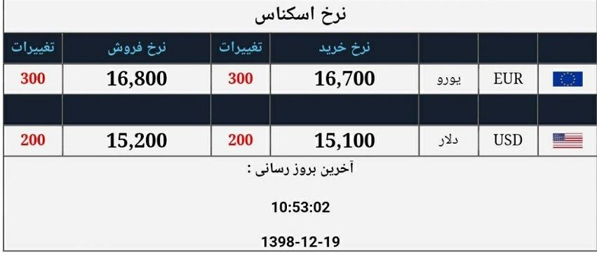 به گزارش سایت طلا بر اساس معاملات انجام شده در صرافی‌های مجاز امروز، (۱۹ اسفند ۹۸) هر دلار آمریکا به مبلغ ۱۵ هزار و ۲۰۰ تومان و هر اسکناس یورو به قیمت ۱۶ هزار و ۸۰۰ تومان معامله شدند.