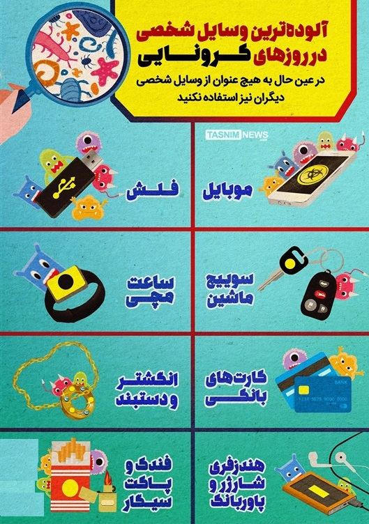 در عین حال به هیچ عنوان از وسایل شخصی دیگران نیز استفاده نکنید. ویروس اسرار آمیزی که این روزها جهان را به خود مشغول کرده است. کارشناسان معتقدند که این ویروس تنفسی از طریق تنفس، لمس سطوح آلوده توسط دستها و سپس تماس دست با بینی، چشم یا دهان منتقل شده و سرعت انتشار بالایی هم دارد. بنابراین لازم است که آلودهترین وسایل شخصیتان را بشناسید که شامل موبایل و هندزفری، کلید و سوییچ ماشین، کیف، کیف پول و کارتهای بانکی، ساعت مچی و زیورآلاتی چون انگشتر و دستبند و فندک و پاکت سیگار است.