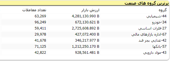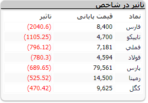 از میان ۶۲ نماد مثبت و ۱۵۲ نماد منفی فرابورس، سنگ آهن گهر زمین، سهامی ذوب آهن اصفهان، هلدینگ صنایع معدنی خاورمیانه، فولاد هرمزگان جنوب، صنایع ماشین های اداری ایران، گروه توسعه مالی مهر آیندگان و توسعه مولد نیروگاهی جهرم نسبت به سایر نمادها بیشترین تاثیر منفی را روی فرابورس گذاشتند.