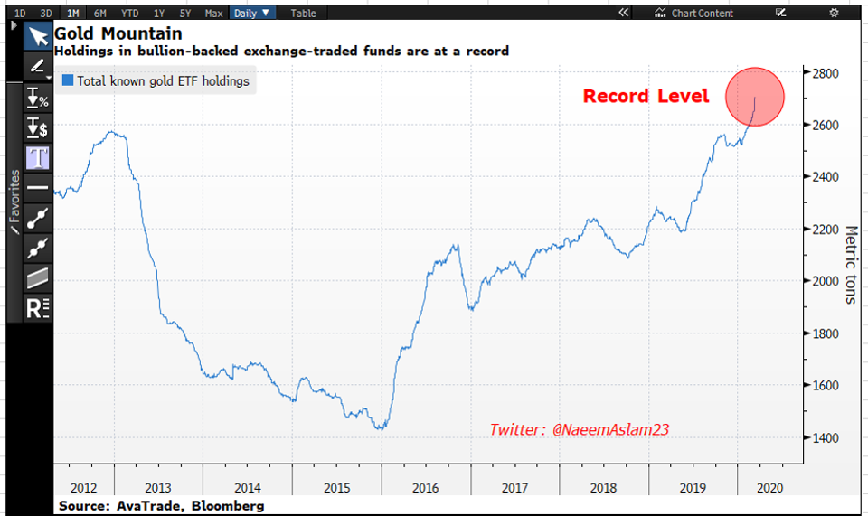 اگر بانک فدرال، نرخ بهره را 50 امتیاز پایه کاهش دهد، این می تواند دوباره قیمت طلا را به بالای 1700 دلار برساند. حتی احتمال صعود بهای این فلز زرد به بالاتر از ۱۷۵۰ دلار یا بیشتر نیز وجود خواهد داشت. اگر به کل داده های ETF مربوط به طلا نگاهی بیندازیم فرضیه ما را تأیید می کند که احتمالاً قیمت طلا افزایش خواهد یافت زیرا کل سهام در ETF در شرایط یک رکورد قرار داشته و جریان ورودی همچنان رو به افزایش است.
