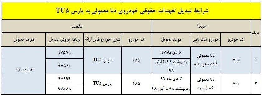 طرح تبدیل حوالههای خودرو دنا به پارس TU۵ + جدول