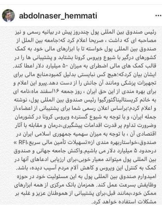 به گزارش سایت طلا عبدالناصر همتی در یادداشت اینستاگرامی نوشت: « رئیس صندوق بین المللی پول چندروز پیش در بیانیه رسمی و نیز مصاحبه ای که داشت ، صریحا اعلام کرد که؛جامعه بین الملل از صندوق بین المللی پول خواسته تا با ابزارهای مالی خود به کمک کشورهای درگیر با شیوع ویروس کرونا بشتابد و پشتیبانی ها را در قالب کمک های مالی اضطرای به میزان 50 میلیارد دلار اعطا کند.