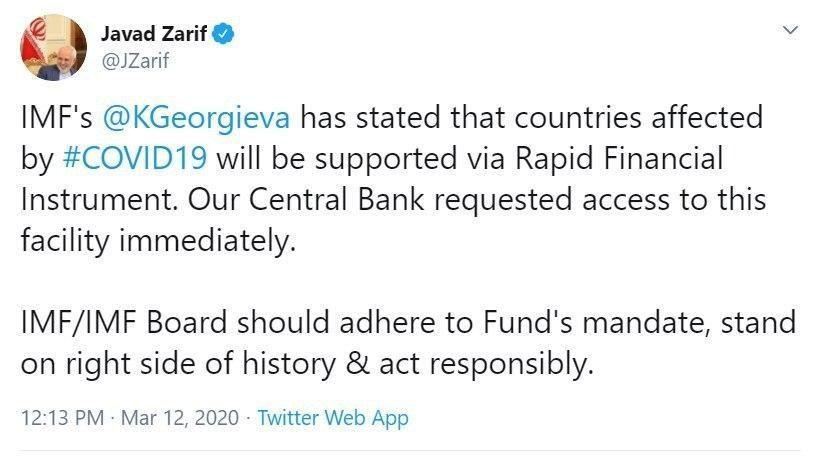 رئیس صندوق بینالمللی پول گفته است از کشورهایی متأثر از کرونا، با ابزار (حمایت) سریع مالی پشتیبانی خواهد شد. بانک مرکزی ایران خواستار دسترسی فوری به این تسهیلات شده است.صندوق بینالمللی پول و هیأت مدیره آن باید به دستور صندوق پایبند باشند، در طرف صحیح تاریخ قرار بگیرند و مسئولانه عمل کنند.