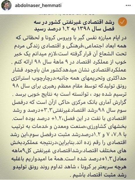 همتی نوشت: در ایام مبارزه نفس گیر با ویروس کرونا و لحظاتی که همه ابعاد اجتماعی،فرهنگی و اقتصادی زندگی مردم تحت الشعاع آن قرار گرفته است، لازم میدانم یک خبر خوب از عملکرد اقتصاد در 9 ماههٔ سال 98 ارائه کنم .