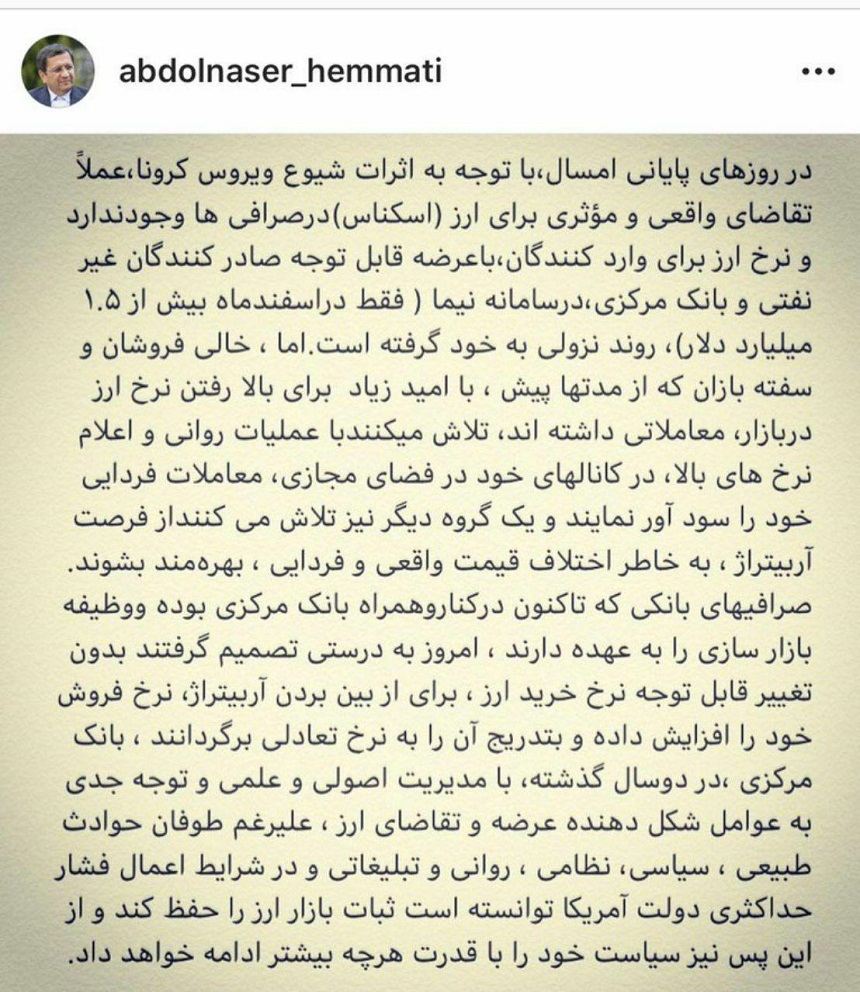 به گزارش سایت طلا ،عبدالناصر همتی رئیس کل بانک مرکزی در تازه ترین یادداشت اینستاگرامی خود نوشت: در روزهای پایانی امسال،با توجه به اثرات شیوع ویروس کرونا،عملاً تقاضای واقعی و مؤثری برای ارز (اسکناس)درصرافی ها وجود ندارد و نرخ ارز برای وارد کنندگان،باعرضه قابل توجه صادر کنندگان غیر نفتی و بانک مرکزی،درسامانه نیما ( فقط دراسفندماه بیش از 1.5 میلیارد دلار)، روند نزولی به خود گرفته است.