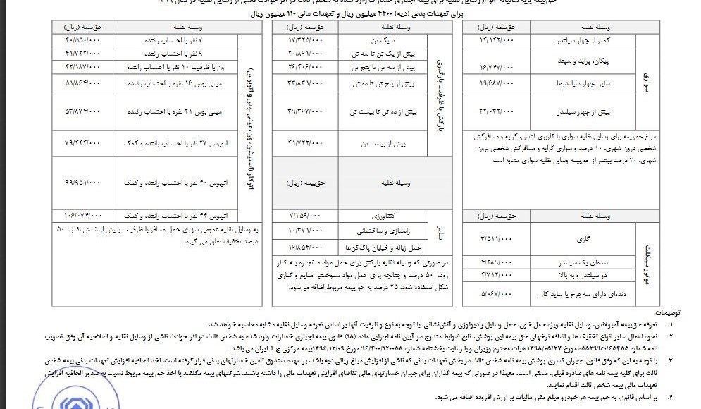 1 ــ نظر به اعلام مبلغ ریالی دیه برای سال 1399 از سوی قوه محترم قضائیه که متضمن 2/22 درصد افزایش در مبلغ ریالی دیه است و با توجه به افزایش 3درصدی نرخ حقبیمه رشته شخص ثالث بهموجب مصوبه شورایعالی بیمه، کلیه شرکتهای بیمه موظفند بیمهنامههای شخص ثالثی را که تاریخ شروع پوشش آنها از 1399/01/01 و پس از آن میباشد، با تعهدات بدنی 4400 میلیون ریال (معادل دیه ماههای حرام) و تعهدات مالی حداقل 110 میلیون ریال و با حقبیمههای مندرج در جدول صادر نمایند. شرکتهای بیمه و نمایندگان آنها مکلفند جدول مذکور را در معرض دید متقاضیان قرار دهند.