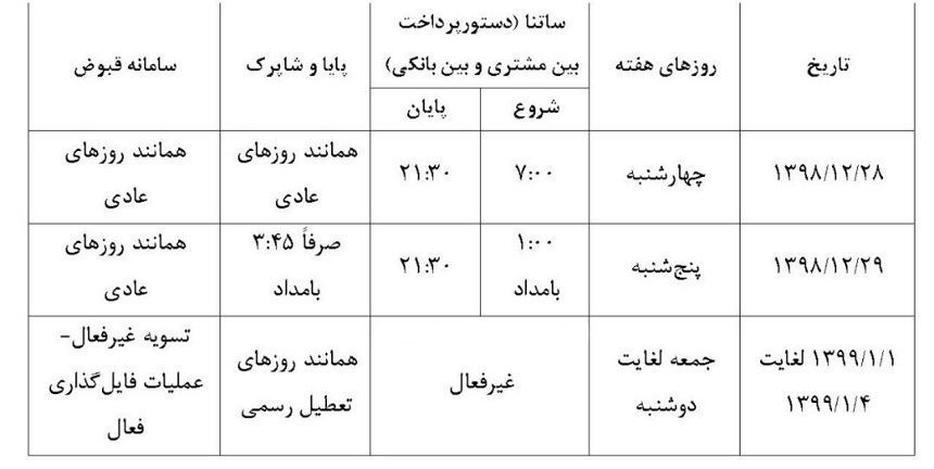 بانک مرکزی جمهوری اسلامی ایران بر اساس روند هر ساله در روزهای پایانی سال و در آستانه ایام نوروز با توجه به تاکید بر ارائه و در دسترس بودن سامانههای خدمات بانکداری الکترونیک، ساعات کاری سامانه ساتنا و پایا را به تمامی بانکها اعلام کرده و شهروندان بر اساس جدول منتشر شده میتوانند از سامانههای ساتنا و پایا در روزهای پایانی سال جاری و در ایام نوروز ۹۹ استفاده کنند.