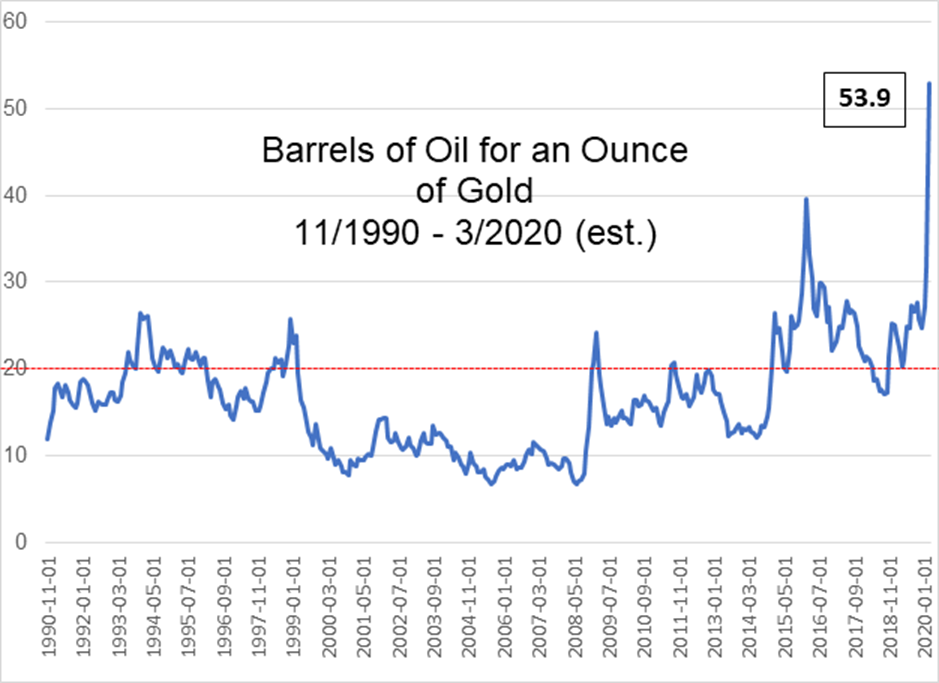 حال سوال اینجاست: هر اونس طلا چقدر شاهد نوسان خواهد بود؟ از منظر تاریخی، پاسخ در محدوده ارزش ۲۰ بشکه (نفت) سیر می کند؛ همانطور که در نمودار فوق نشان داده شده است. هنگامی که نفت محبوب می شود، همانطور که در دوره پس از ۱۱ سپتامبر ۲۰۰۱ تا رکود سال ۲۰۰۷-۲۰۰۸ اتفاق افتاد، یک اونس طلا نیز فاصله چندان دوری نمی رود. البته اخیرا بهای یک اونس طلا معادل مقادیر زیادی نفت شده است، حدود ۵۳.۹ بشکه.