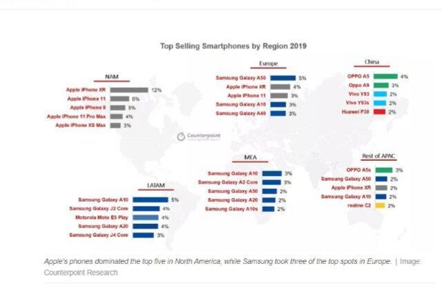 این کارشناسان با بررسی و تحلیل میزان فروش گوشی های هوشمند محبوب و پرطرفدار در بازار مناطق و کشورهای مختلف ، به جمع بندی زیر رسیده اند که نشان می دهد اپل بازار کشورهای آمریکای شمالی که شامل ایالات متحده و کانادا می شود را تحت سلطه خود گرفته و سامسونگ نیز بازار کشورهای دیگر به خصوص اروپا و خاورمیانه را در اختیار گرفته است.