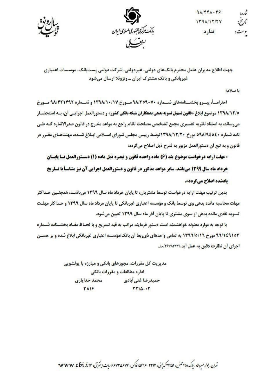 بخشنامه جدید بانک مرکزی برای تسویه بدهکاران بانکی/ تمدید ۳ ماهه همه مهلتهای قانونی
