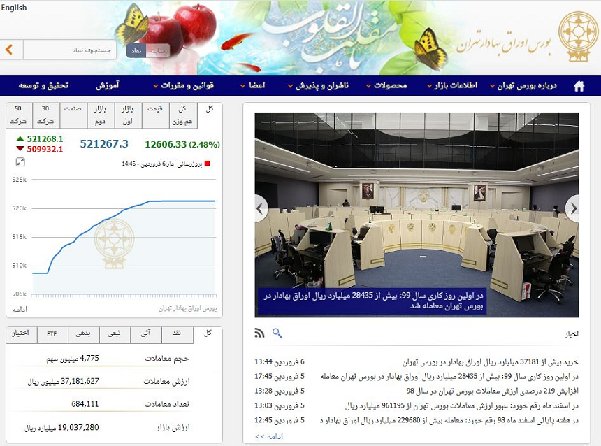 به گزارش سایت طلا ، شاخص کل بورس اوراق بهادار تهران در پایان معاملات امروز چهارشنبه (6 فروردین 99) با جهش 12 هزار و 605 واحد به رقم 521 هزار و 267 واحد رسید.