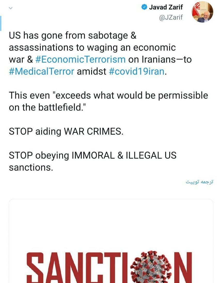 به گزارش سایت طلا ، درتوییت محمد جواد ظریف آمده است: "در هنگامه شیوع کرونا، ایالات متحده از خرابکاری و آدمکشی پا را فراتر گذاشته و جنگ اقتصادی، تروریسم اقتصادی و تروریسم بهداشتی علیه ایرانیان راه انداخته است. این کار حتی فراتر از اقدامات مجاز در صحنه جنگ است. معاونت در جنایات جنگی را متوقف کنید! پیروی از تحریمهای غیراخلاقی و غیرقانونی ایالات متحده را متوقف کنید."